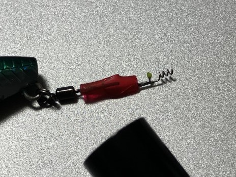 このように、鮎ルアーのハリス止めに通し、その上から熱収縮チューブで固定すればオッケー。