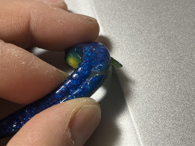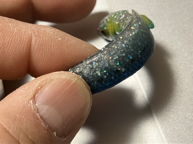 ちょっと見にくいが、半分より下にヒラメに齧られた痕跡。1回目のバイトによるものだろうか?