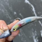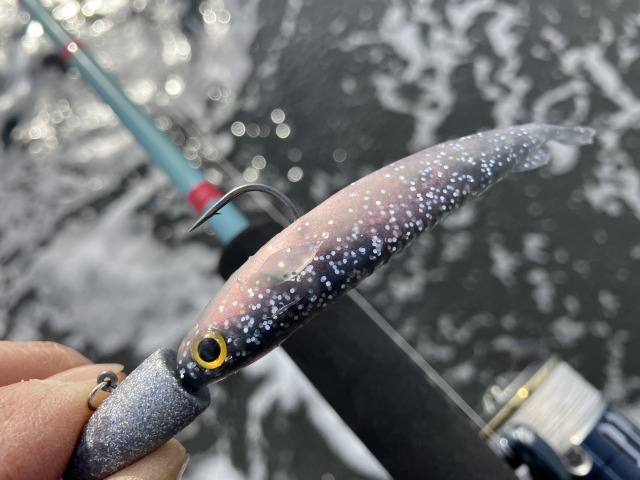 ボトムから中層を攻める際は、シーバスジグヘッドSS 21グラムに、カタクチミノー4インチの組み合わせ。